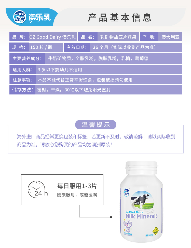 英文名称:Milk Minerals产品规格:150粒/瓶适用人群:3岁以上人群产品介绍:添加乳矿物盐,钙磷元素比与人体骨骼牙齿的组成接近,合理的钙磷比使补钙效果更好。产品价格:价格面议