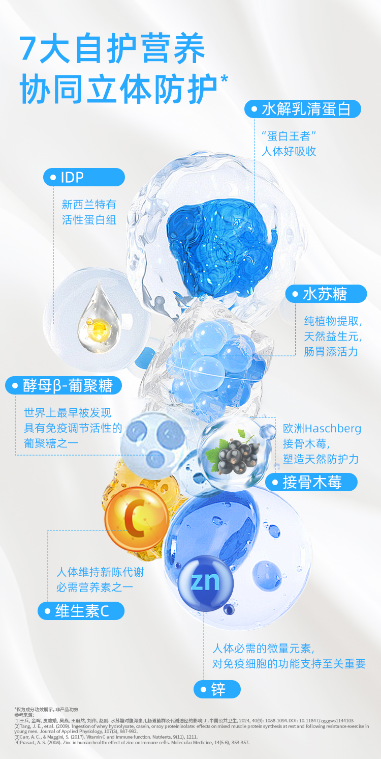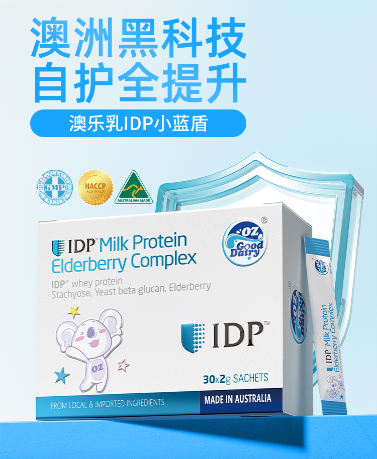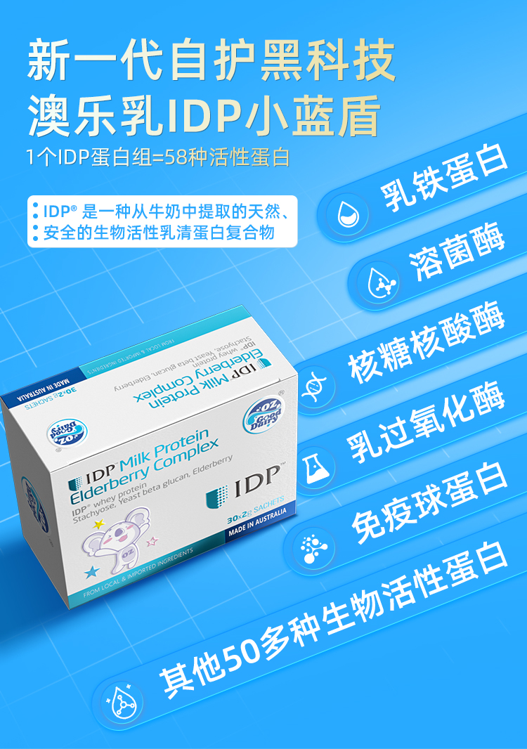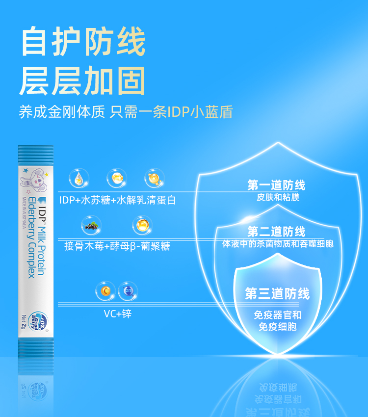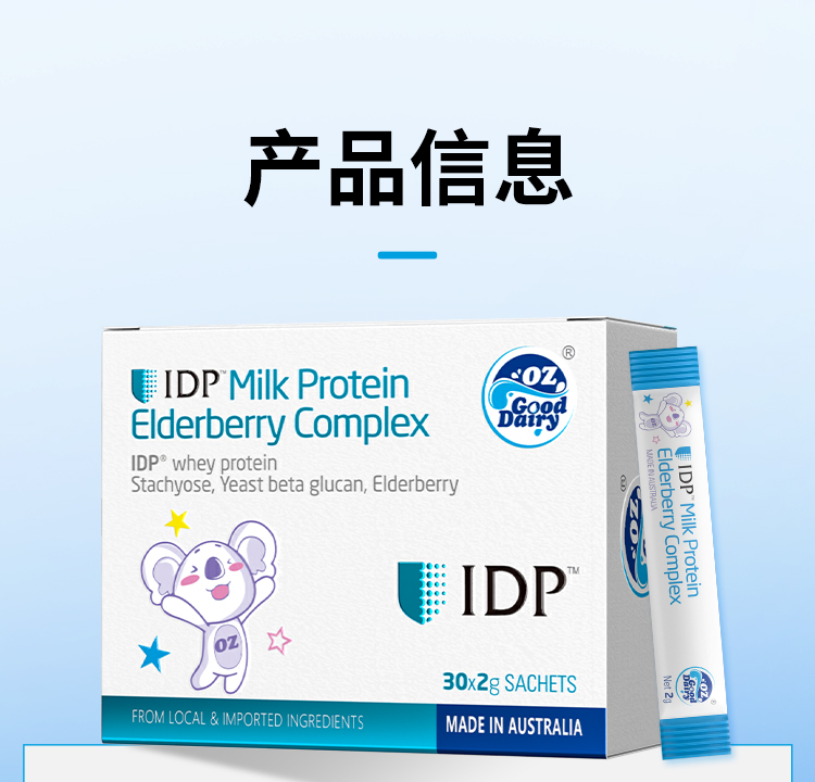 产品介绍:采用新西兰专利免疫防御蛋白IDP,包含乳铁蛋白等58种优质活性蛋白质。搭配酵母β-葡聚糖、接骨木莓等多重自护营养,配方纯净,温和提升自护力。