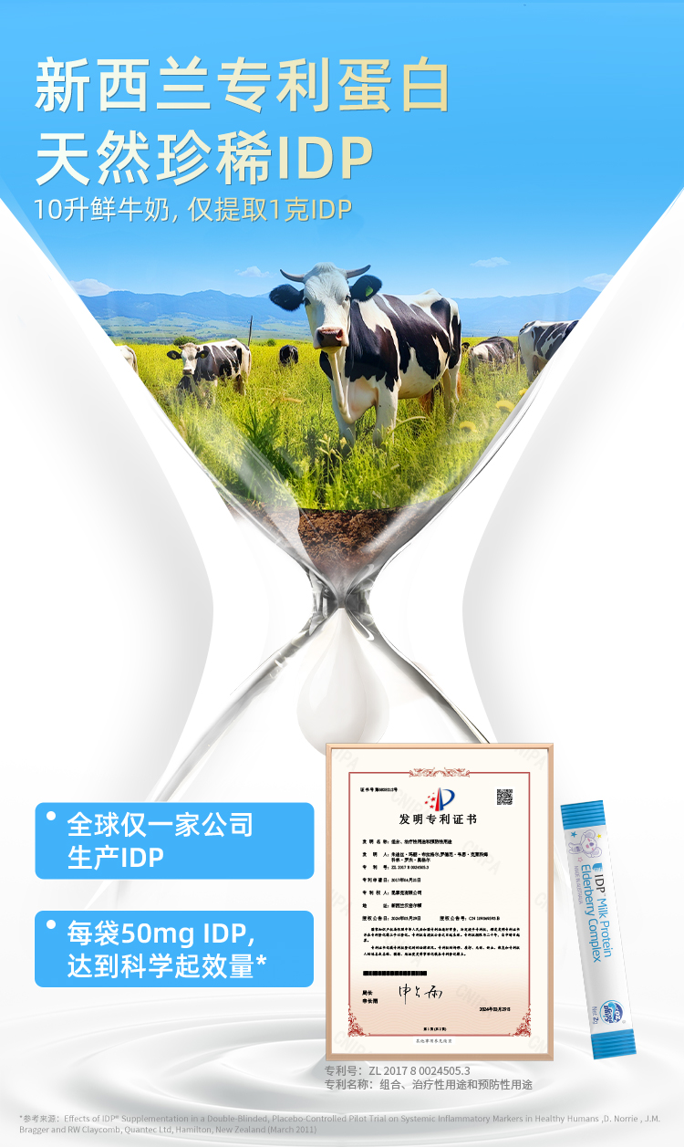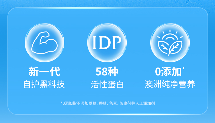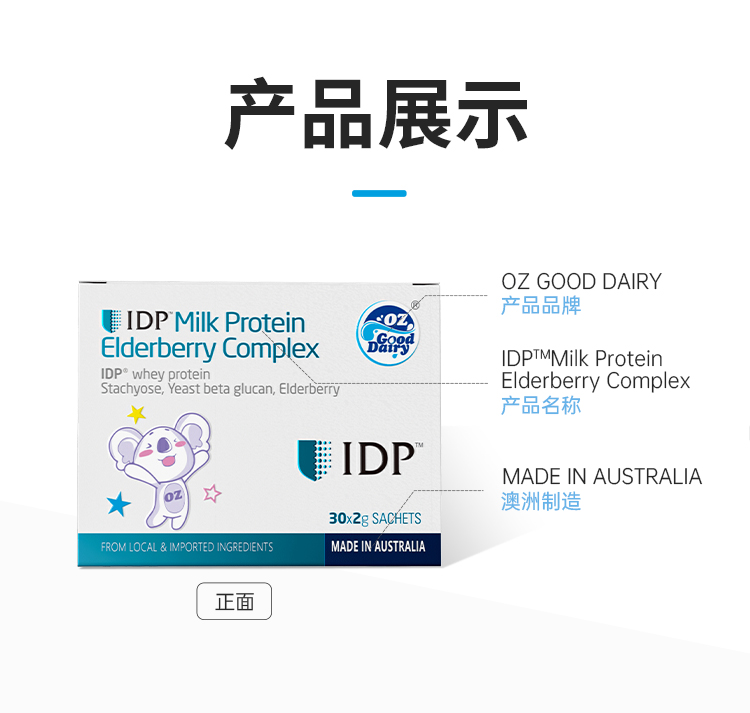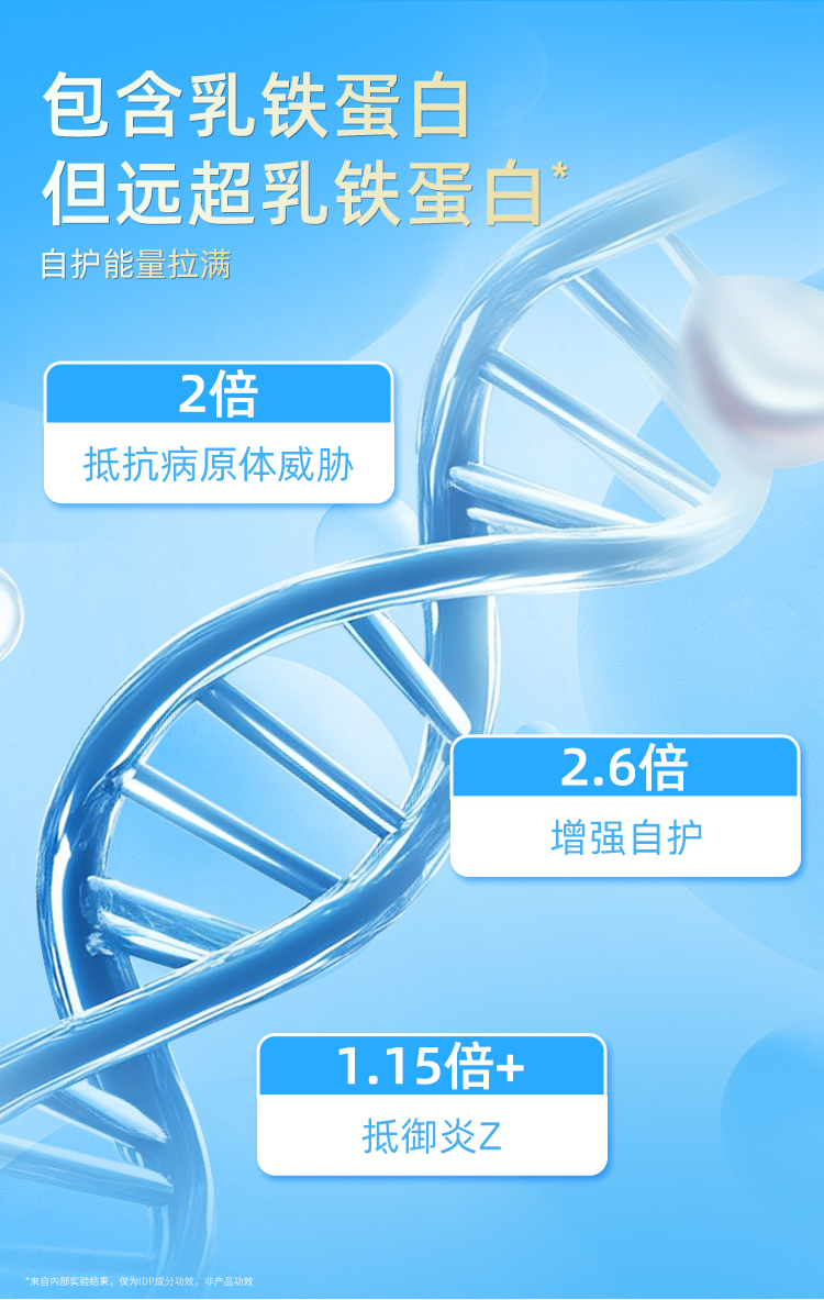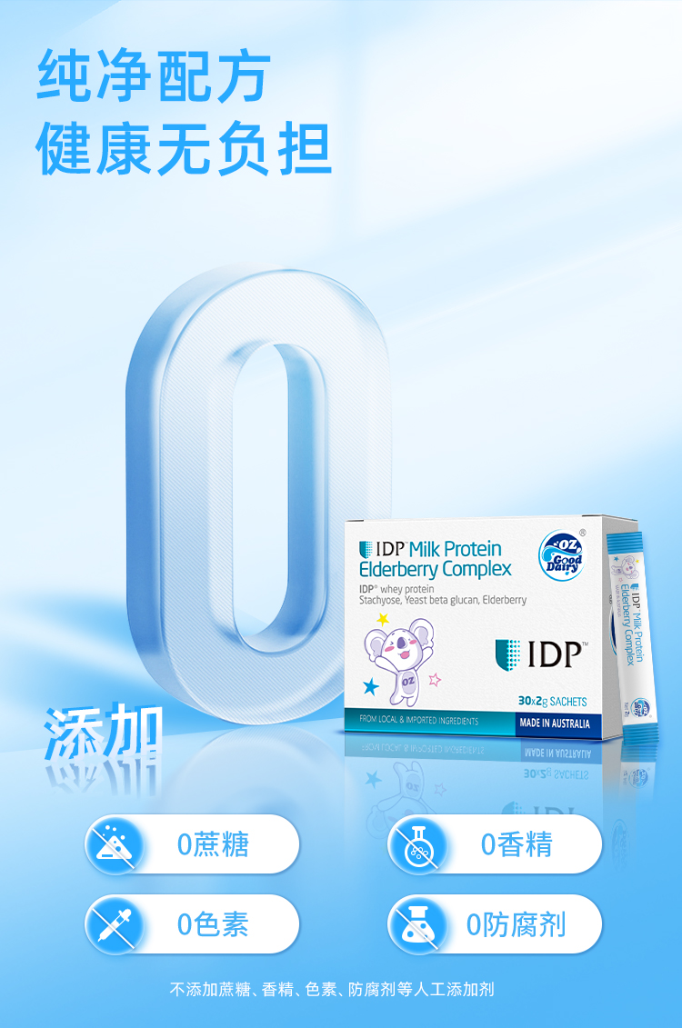 产品介绍:采用新西兰专利免疫防御蛋白IDP,包含乳铁蛋白等58种优质活性蛋白质。搭配酵母β-葡聚糖、接骨木莓等多重自护营养,配方纯净,温和提升自护力。