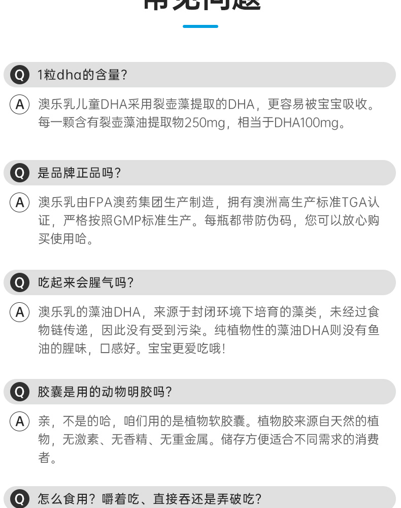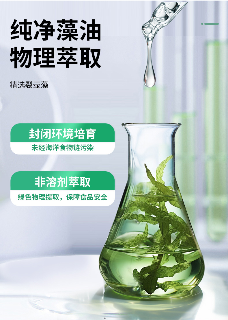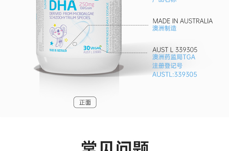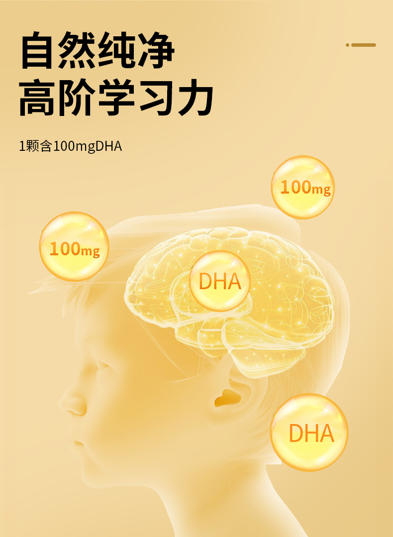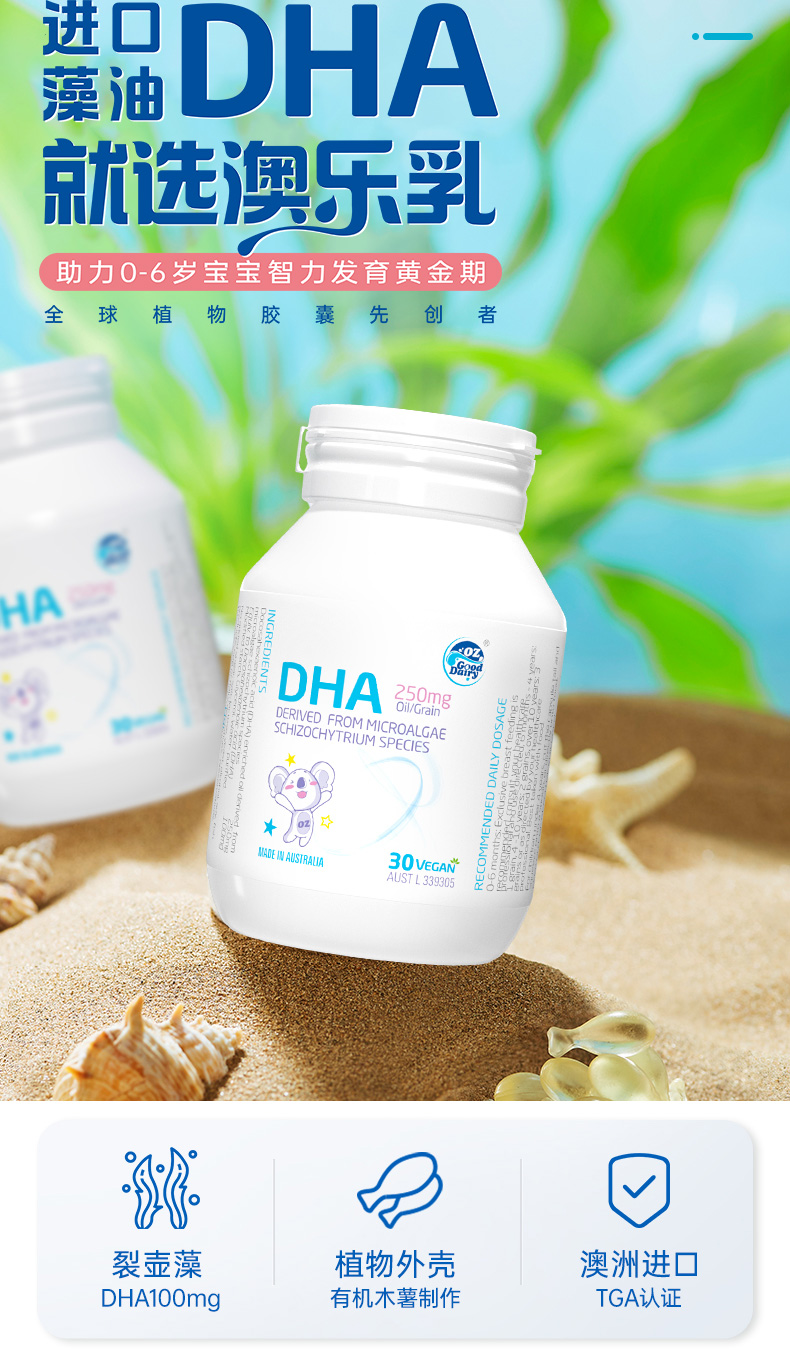 采用有机木薯淀粉来源植物胶囊,无病毒、激素或重金属污染风险。选取封闭环境培育提取的裂壶藻油,未经海洋食物链污染,天然安全。每粒含100mg DHA,满足日常所需。DHA被称为“脑黄金”,是婴童成长发育的一种必需Omega-3脂肪酸,可以促进神经网络形成和视网膜发育,呵护宝宝眼脑健康。澳洲进口,TGA权威认证。