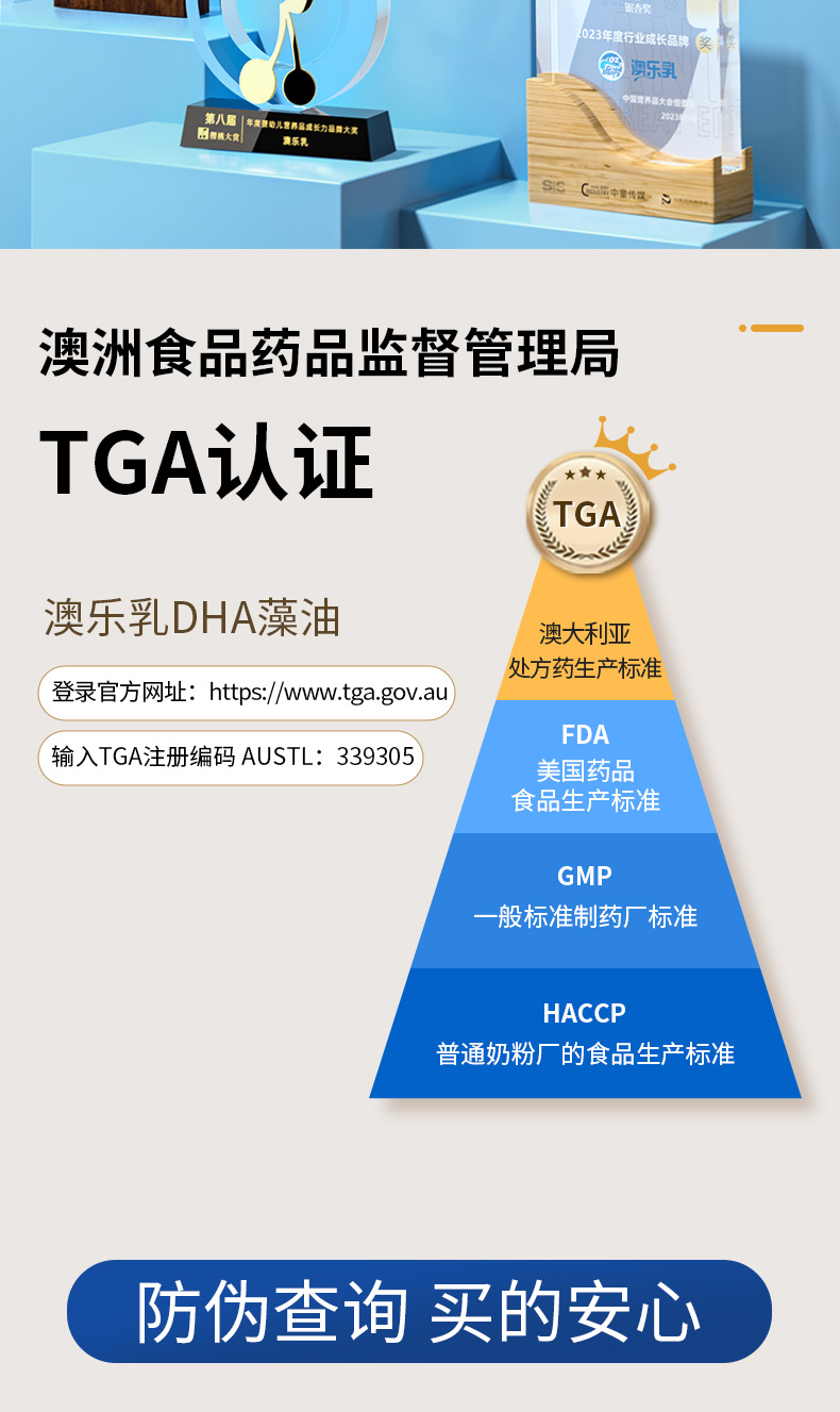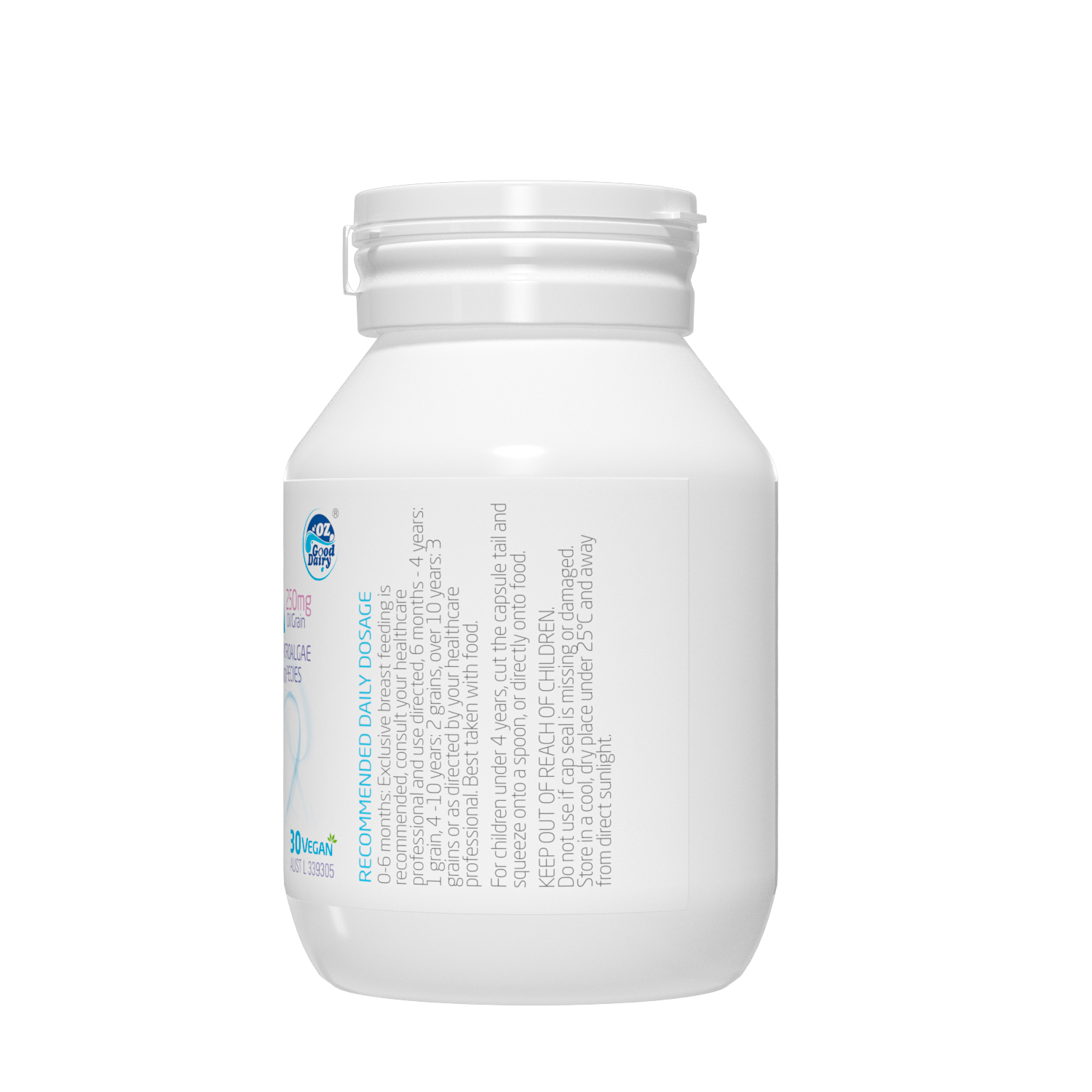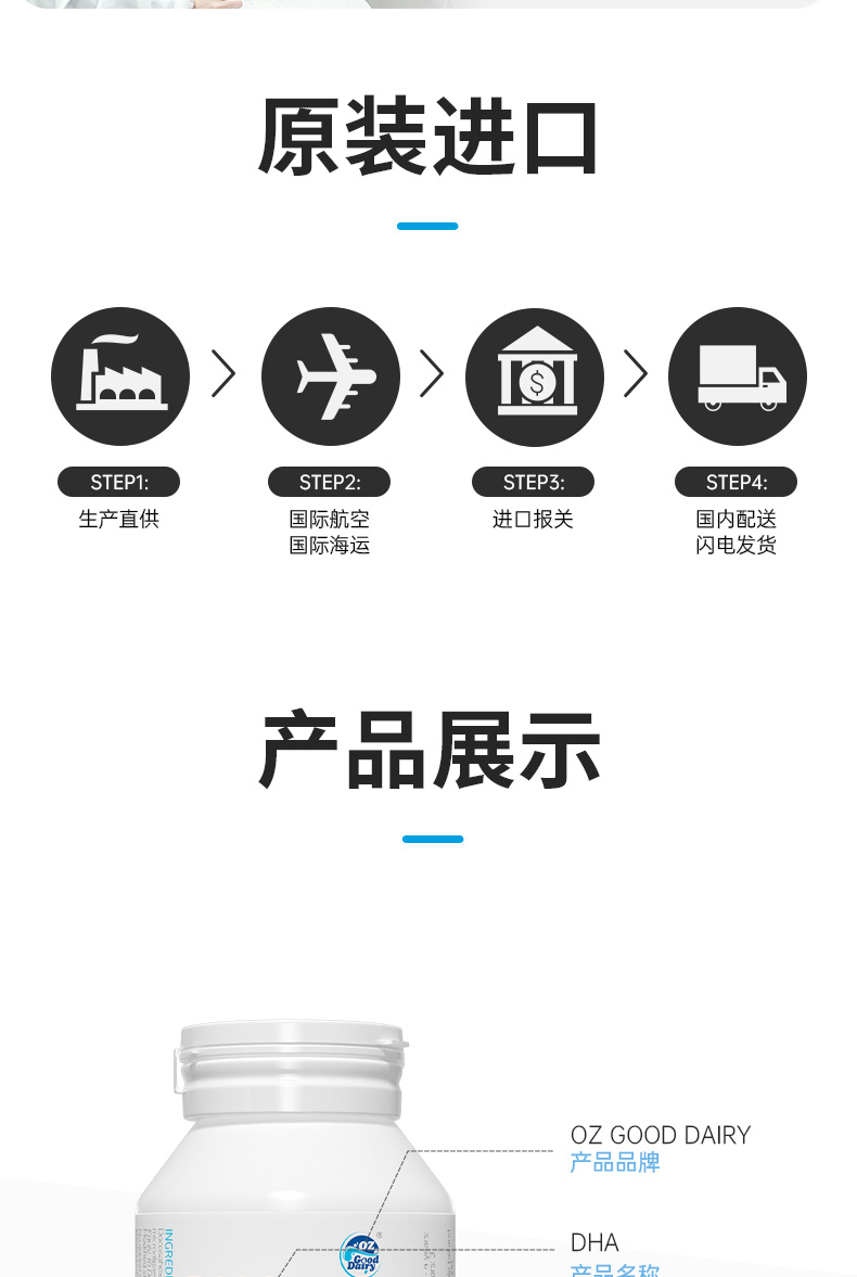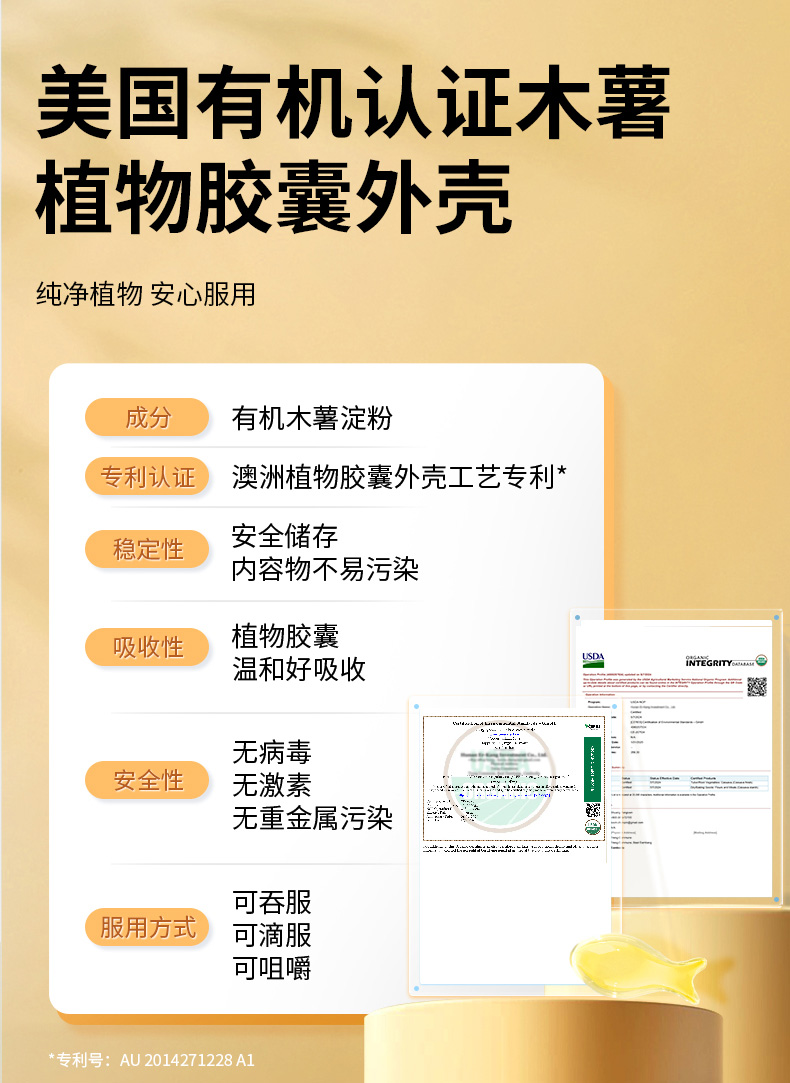 采用有机木薯淀粉来源植物胶囊,无病毒、激素或重金属污染风险。选取封闭环境培育提取的裂壶藻油,未经海洋食物链污染,天然安全。每粒含100mg DHA,满足日常所需。DHA被称为“脑黄金”,是婴童成长发育的一种必需Omega-3脂肪酸,可以促进神经网络形成和视网膜发育,呵护宝宝眼脑健康。澳洲进口,TGA权威认证。